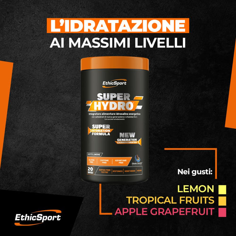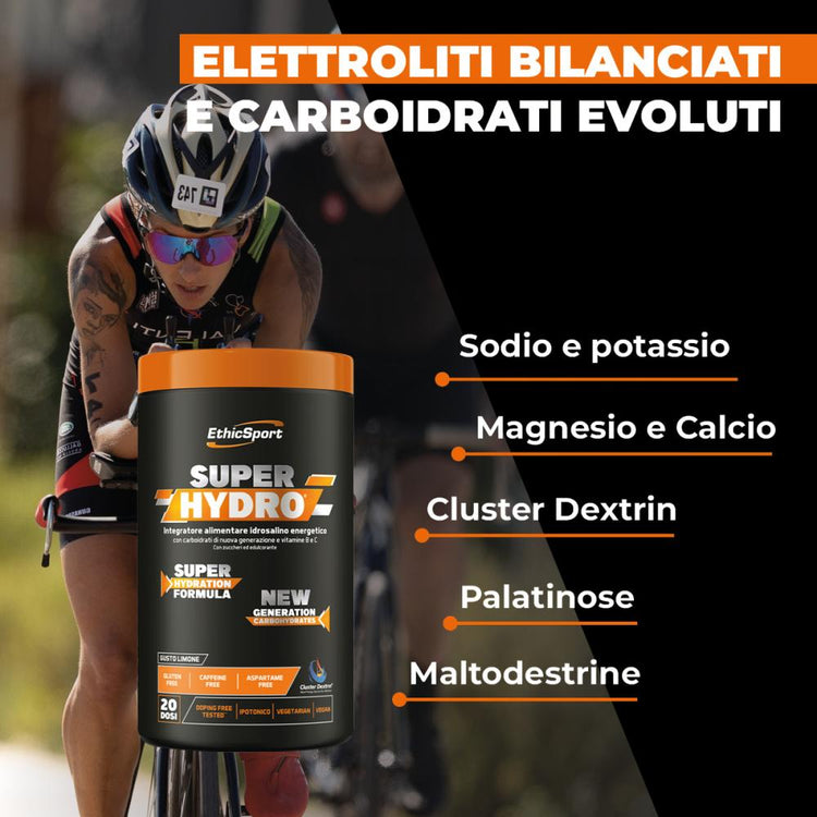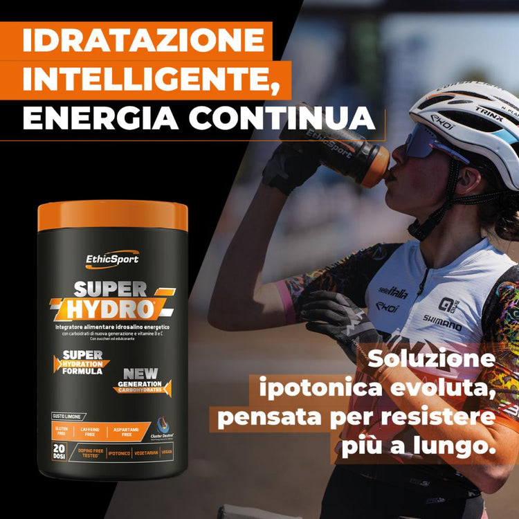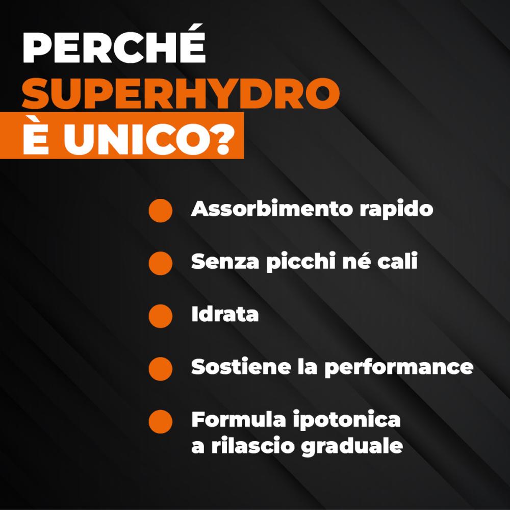 SuperHydro™ è un integratore alimentare idrosalino energetico sviluppato per ottenere una miscela ipotonica, con carboidrati ed elettroliti. La soluzione mantiene prestazioni di resistenza durante l’esercizio fisico prolungato e aumenta l’assorbimento di acqua durante l’attività fisica, per un’idratazione ottimale. Il complesso SH, caratterizzato da carboidrati di nuova generazione (destrine cicliche altamente ramificate e maltodestrina DE6), permette una cessione dell’energia differenziata, a rilascio rapido e graduale. La presenza di vitamine del gruppo B e vitamina C contribuisce al normale metabolismo energetico, alla riduzione della stanchezza e dell’affaticamento (vit. B6, acido pantotenico, vit. C), alla normale funzione cardiaca (tiamina), alla normale formazione dei globuli rossi (vit. B6) e alla protezione delle cellule dallo stress ossidativo (vit. C). Sodio, potassio, magnesio e calcio sono bilanciati per un’ottimale ripristino degli elettroliti.