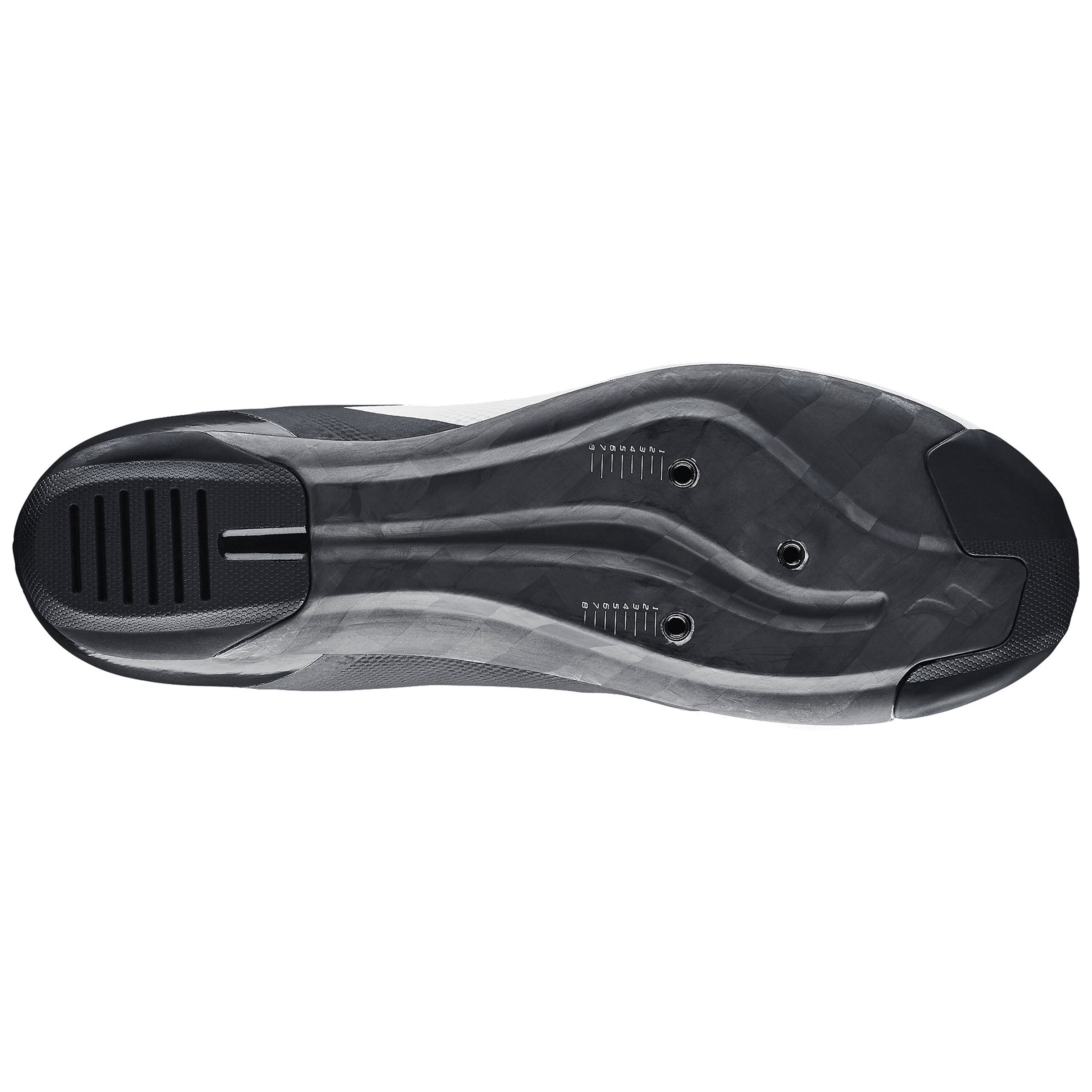 Suola in fibra di carbonio, leggera e moderatamente rigida con rivestimento in gomma sulla punta e sul tallone per la trazione.