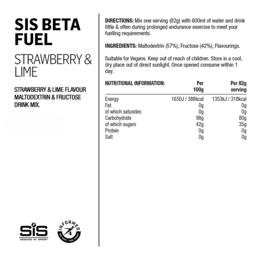 Da tempo apprezzato dagli atleti professionisti, il famoso Beta Fuel Energy Drink di Science in Sport è stato ottimizzato, rendendolo un integratore dalla formulazione scientifica superiore. Un nuovissimo rapporto di 1:0,8 di 80g di carboidrati aumenta la tua potenza, ottimizza l'assorbimento dei carboidrati e riduce i disturbi gastrointestinali.